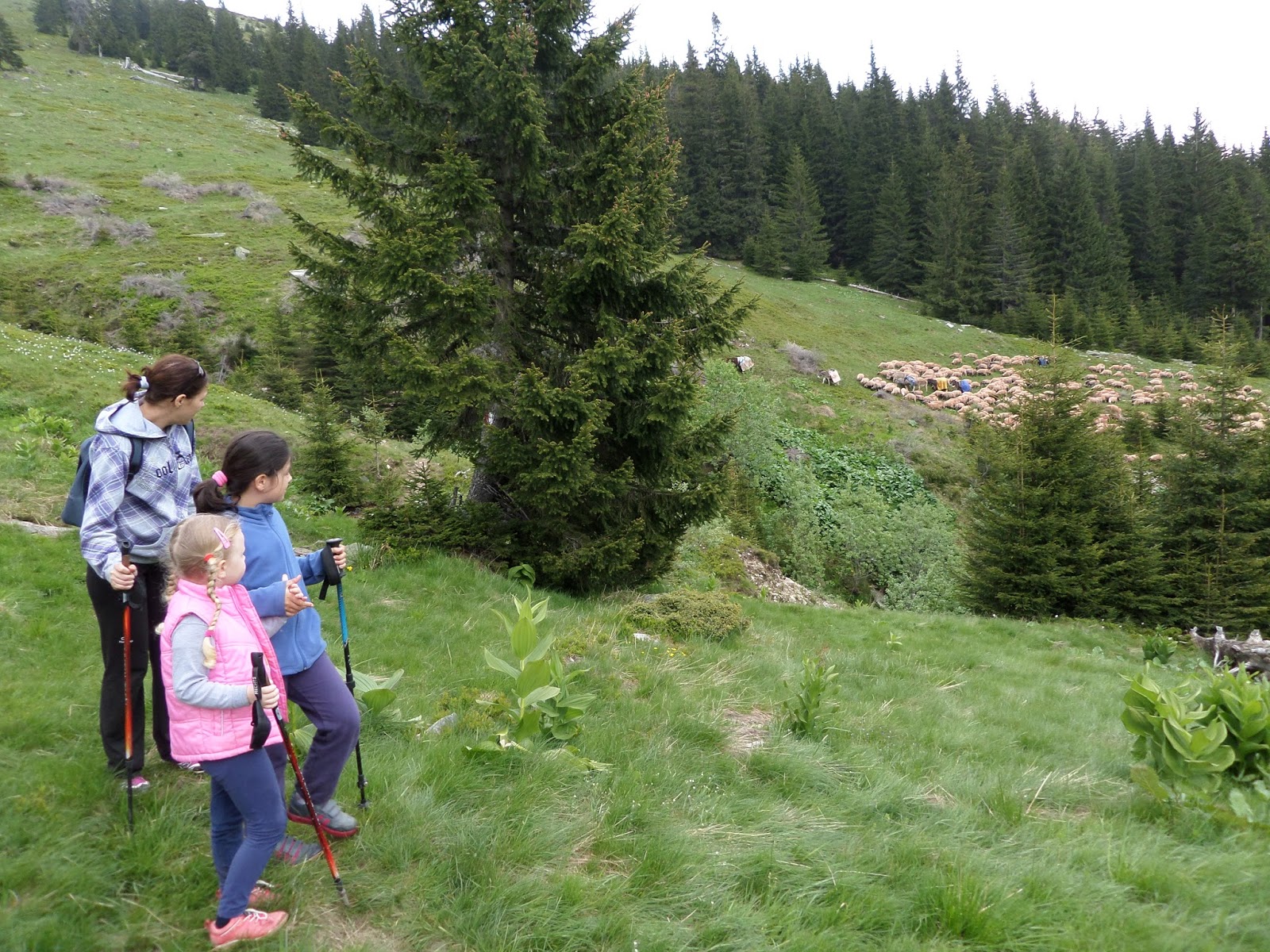 | La urcarea pe traseu am intalnit si oitele care si ele acum urcau la munte, unde raman toata vara, fericite sa pasca iarba verde si grasa de pe pajistile alpine. |
